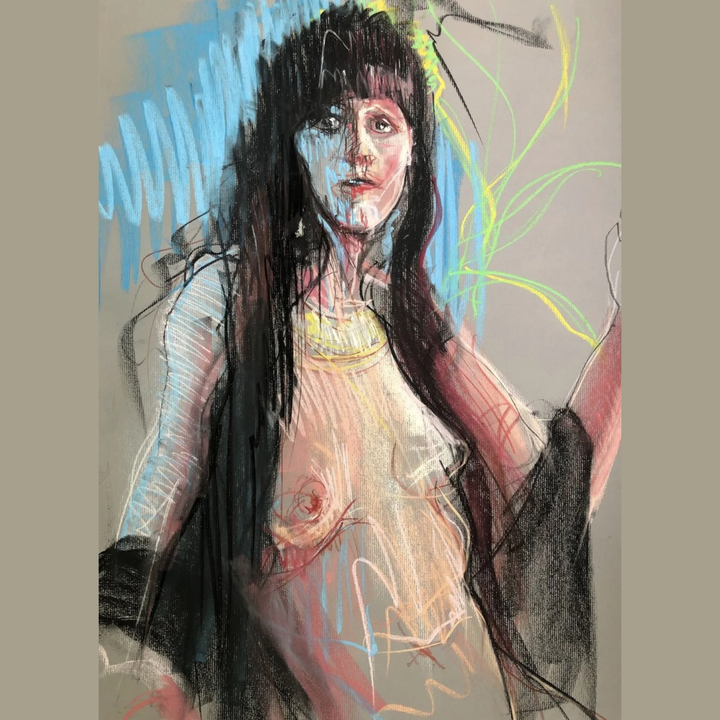 Mixed media artist, Shelby Alexander, expands contemporary concepts of drawing and painting by combining figurative works on paper with recycled textile backgrounds, referencing the pollution of the clothing industry. Her work highlights the tension between the modern experience of beauty, consumption, and industrialization—and the long-term environmental impact of the clothing we wear.